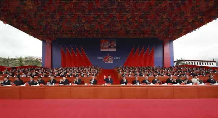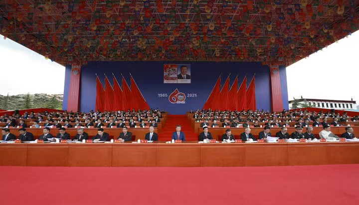 古城拉萨彩旗飘扬,处处洋溢着节日的氛围。雄伟的布达拉宫下,搭建起藏式风格的大会主席台。主席台上方中华人民共和国国徽和“西藏自治区成立60周年庆祝大会”横幅十分醒目,背景墙上悬挂着大庆会徽和“1965”“2025”字样,10面红旗分列两侧。主席台对面的布达拉宫广场上,身着节日盛装的各族群众从四面八方汇聚到这里,手中挥动着红旗,汇聚成一片欢乐的海洋。